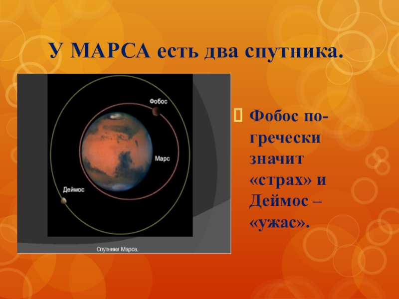 У МАРСА есть два спутника.Фобос по-гречески значит «страх» и Деймос – «ужас».