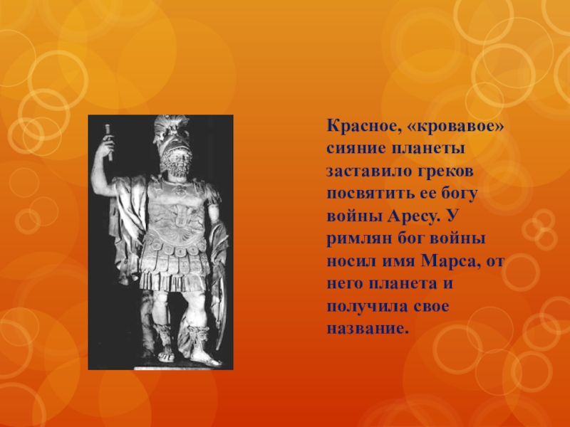 Слайд 3Красное, «кровавое» сияние планеты заставило греков посвятить ее богу войны Аресу.