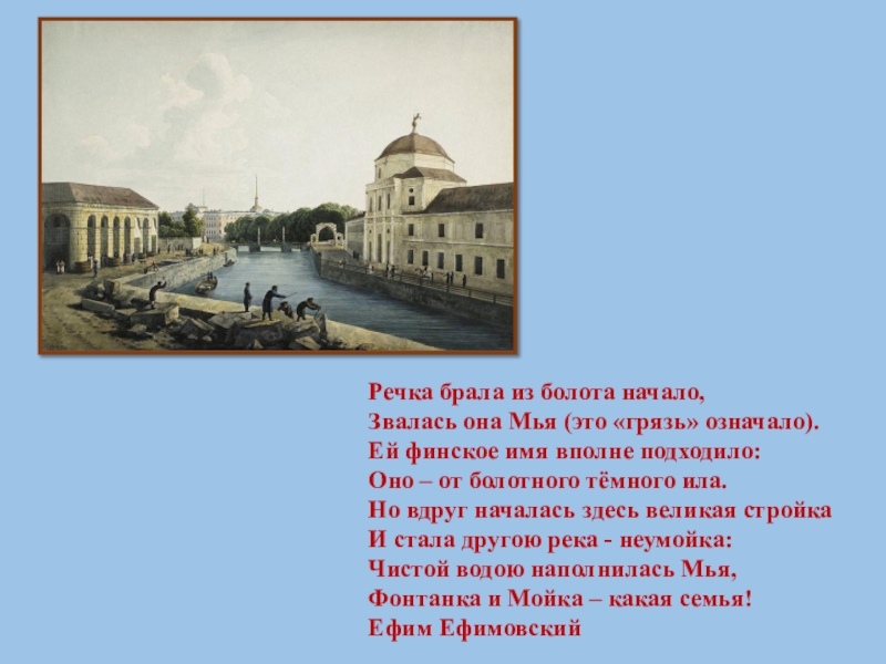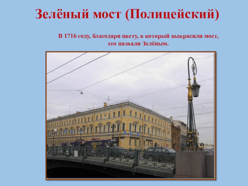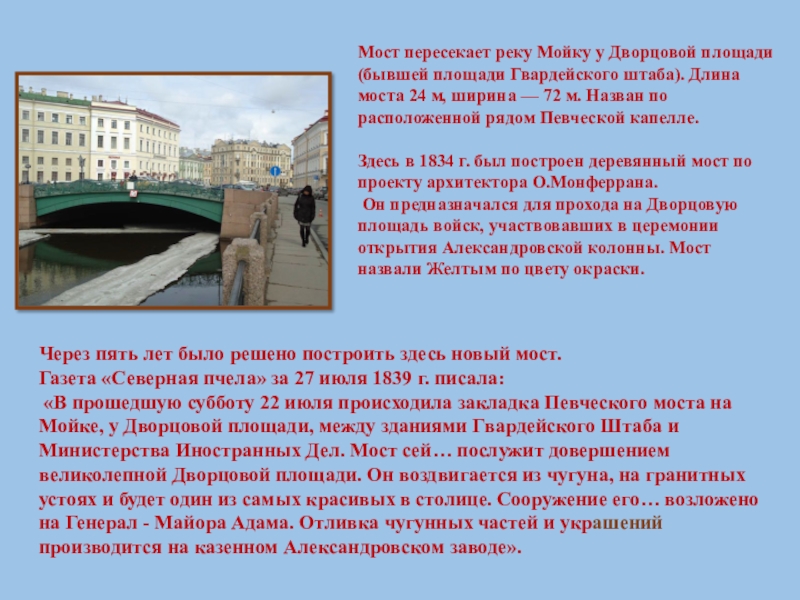 «В прошедшую субботу 22 июля происходила закладка Певческого моста на Мойке, у Дворцовой площади, между зданиями Гвардейского Штаба и Министерства Иностранных Дел. Мост сей… послужит довершением великолепной Дворцовой площади. Он воздвигается из чугуна, на гранитных устоях и будет один из самых красивых в столице. Сооружение его… возложено на Генерал - Майора Адама. Отливка чугунных частей и украшений производится на казенном Александровском заводе».