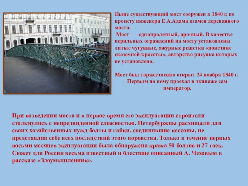 При возведении моста и в первое время его эксплуатации строители столкнулись с непредвиденной сложностью. Петербуржцы расхищали для своих хозяйственных нужд болты и гайки, соединявшие кессоны, не представляя себе всех последствий этого воровства. Только в течение первых восьми месяцев эксплуатации была обнаружена кража 50 болтов и 27 гаек. Сюжет для России весьма известный и блестяще описанный А. Чеховым в рассказе «Злоумышленник».