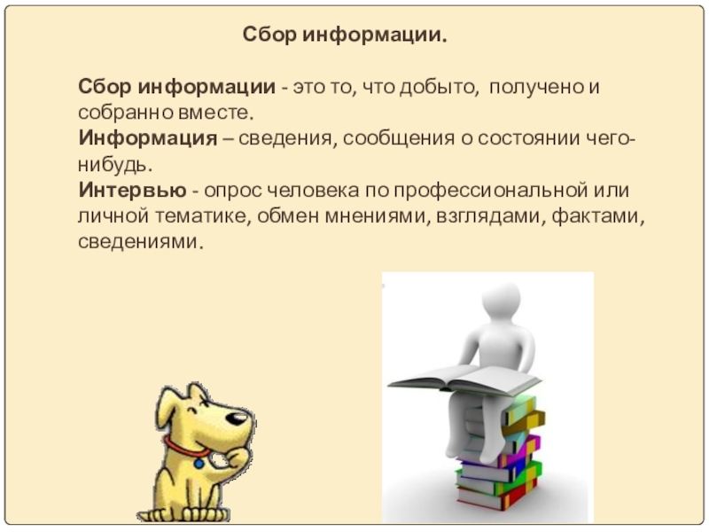 Сбор информации. Сбор информации - это то, что добыто, получено и собранно вместе. Информация – сведения, сообщения о состоянии чего-нибудь. Интервью - опрос человека по профессиональной или личной тематике, обмен мнениями, взглядами, фактами, сведениями.