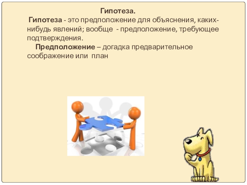 Гипотеза. Гипотеза - это предположение для объяснения, каких-нибудь явлений; вообще - предположение, требующее подтверждения.   Предположение – догадка предварительное соображение или план