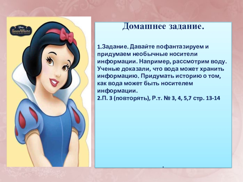 Домашнее задание.1.Задание. Давайте пофантазируем и придумаем необычные носители информации. Например, рассмотрим воду. Ученые доказали, что вода может