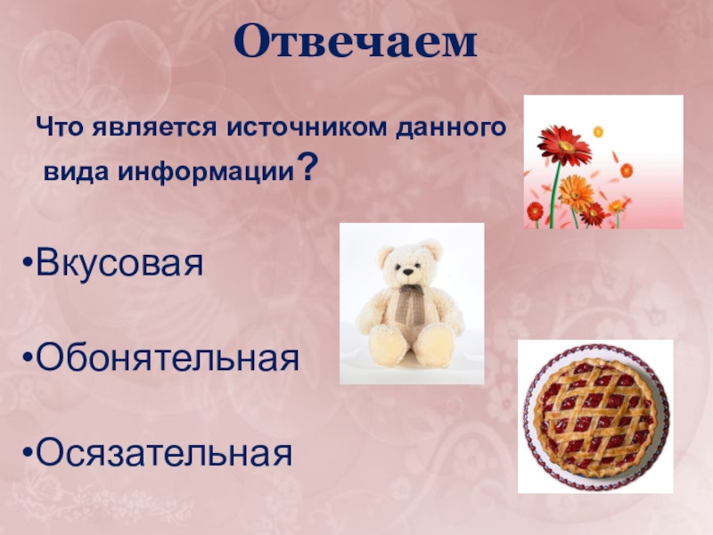 ОтвечаемЧто является источником данного вида информации?ВкусоваяОбонятельнаяОсязательная
