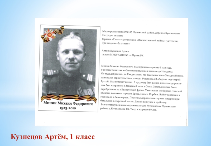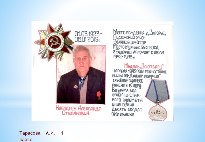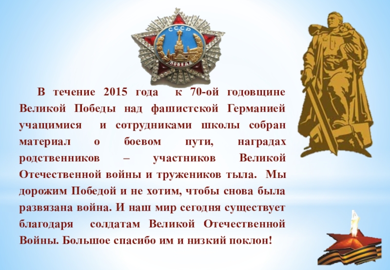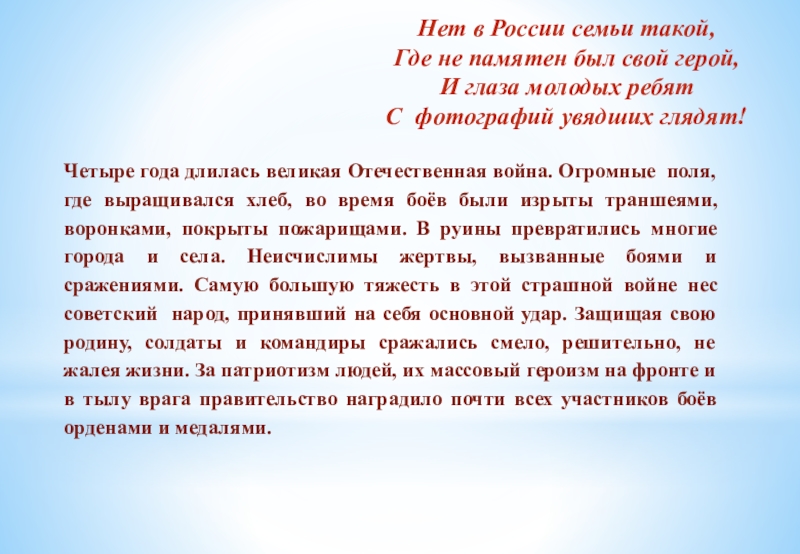 Четыре года длилась великая Отечественная война. Огромные поля, где выращивался хлеб, во время боёв были изрыты траншеями, воронками, покрыты пожарищами. В руины превратились многие города и села. Неисчислимы жертвы, вызванные боями и сражениями. Самую большую тяжесть в этой страшной войне нес советский народ, принявший на себя основной удар. Защищая свою родину, солдаты и командиры сражались смело, решительно, не жалея жизни. За патриотизм людей, их массовый героизм на фронте и в тылу врага правительство наградило почти всех участников боёв орденами и медалями.