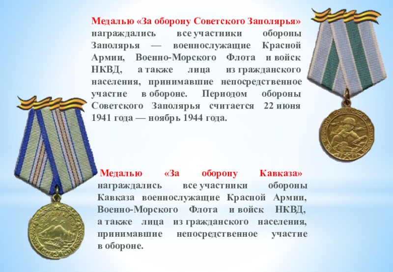 Медалью «За оборону Кавказа» награждались все участники обороны Кавказа военнослужащие Красной Армии, Военно-Морского Флота и войск НКВД, а также лица из гражданского населения, принимавшие непосредственное участие в обороне.
