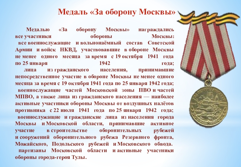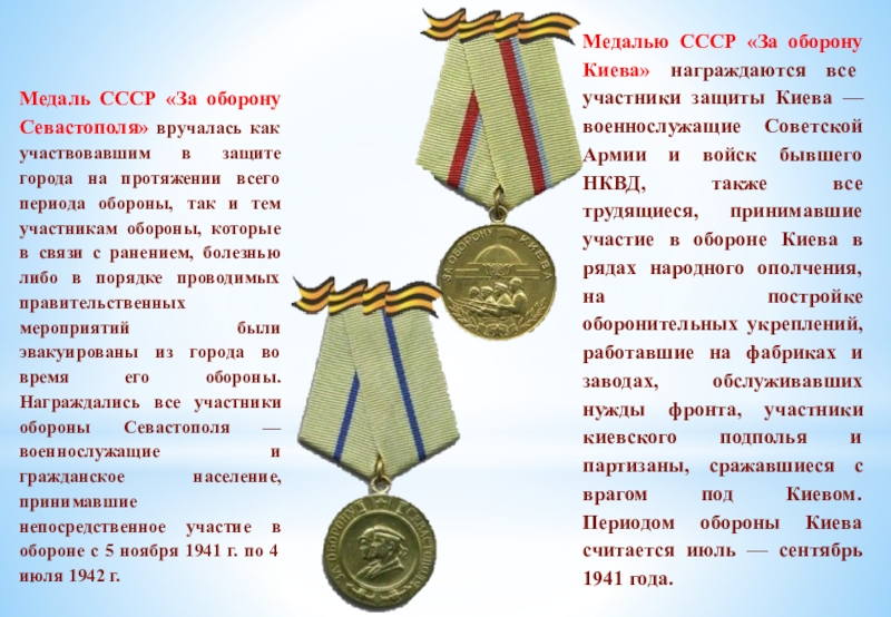 Медалью СССР «За оборону Киева» награждаются все участники защиты Киева — военнослужащие Советской Армии и войск бывшего НКВД, также все трудящиеся, принимавшие участие в обороне Киева в рядах народного ополчения, на постройке оборонительных укреплений, работавшие на фабриках и заводах, обслуживавших нужды фронта, участники киевского подполья и партизаны, сражавшиеся с врагом под Киевом. Периодом обороны Киева считается июль — сентябрь 1941 года.