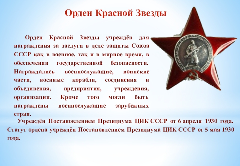 Учреждён Постановлением Президиума ЦИК СССР от 6 апреля 1930 года. Статут ордена учреждён Постановлением Президиума ЦИК СССР от 5 мая 1930 года.