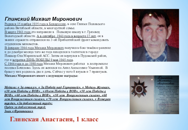 Медали: « За отвагу», « За Победу над Германией», « Медаль Жукова», «30 лет Победы в ВОВ» , «40лет Победы в ВОВ», «50 лет Победы в ВОВ», «60 лет Победы в ВОВ», «50 лет Вооруженным силам», «60 лет Вооруженным силам», «70 лет Вооруженным силам», « Ветеран труда», «За доблестный труд»;