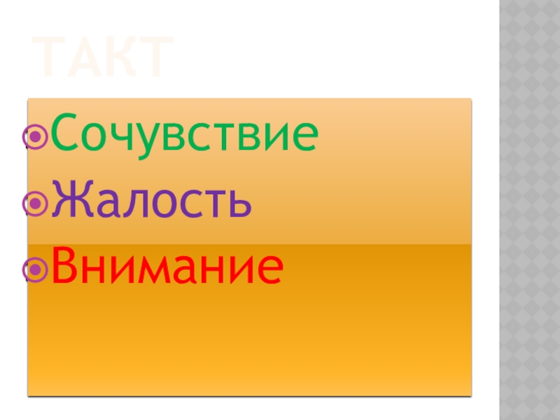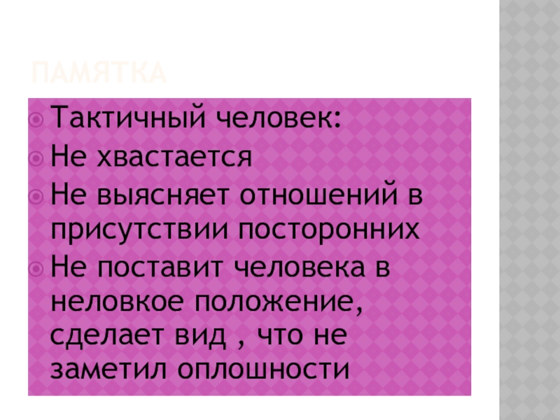 ПамяткаТактичный человек:Не хвастаетсяНе выясняет отношений в присутствии постороннихНе поставит человека в неловкое положение, сделает вид , что