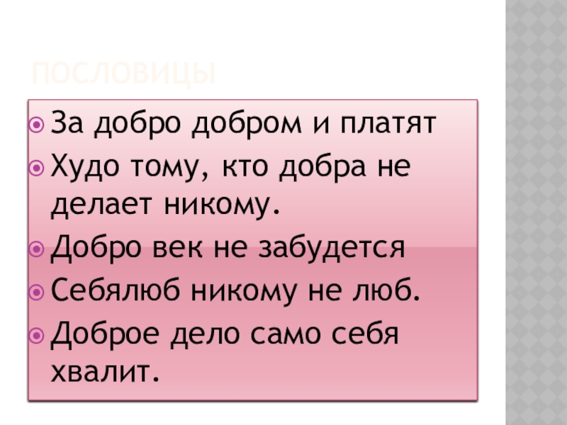 ПословицыЗа добро добром и платятХудо тому, кто добра не делает никому.Добро век не забудетсяСебялюб никому не люб.Доброе