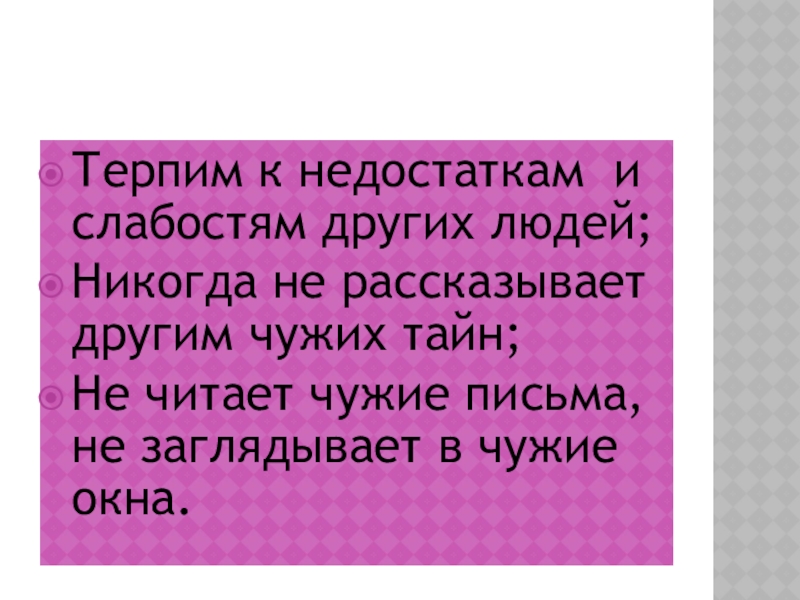 Терпим к недостаткам и слабостям других людей;Никогда не рассказывает другим чужих тайн;Не читает чужие письма, не заглядывает