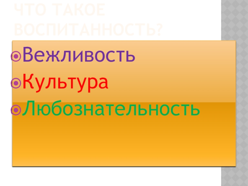 Что такое воспитанность?ВежливостьКультураЛюбознательность