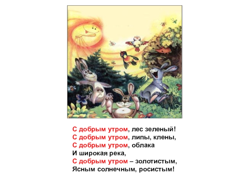 С добрым утром, лес зеленый!С добрым утром, липы, клены,С добрым утром, облакаИ широкая река,С добрым утром –