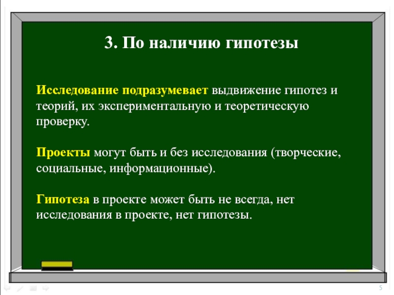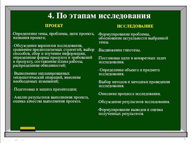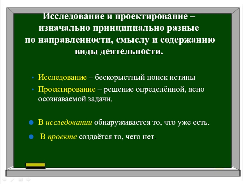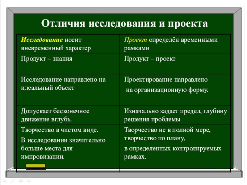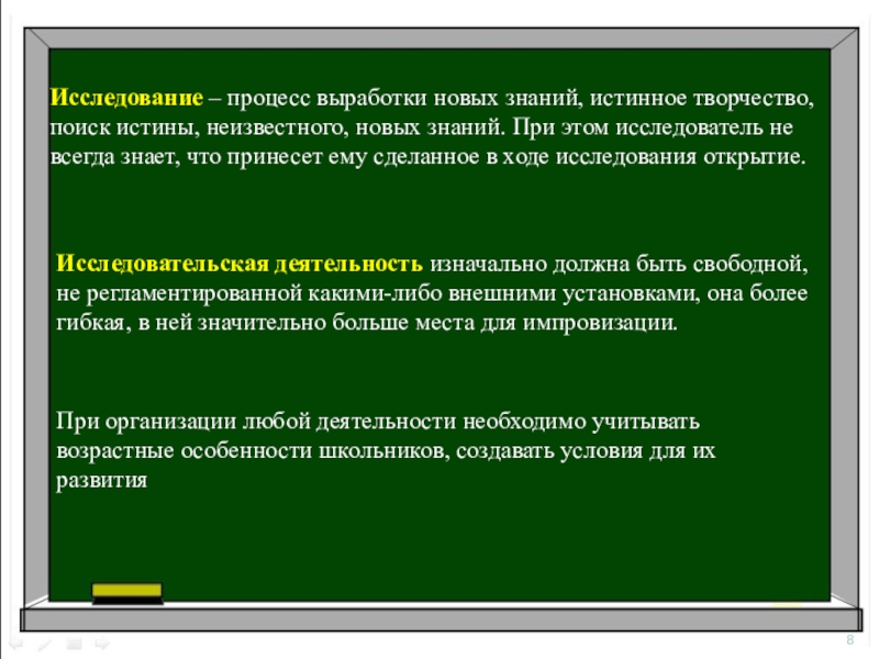 Исследовательская деятельность изначально должна быть свободной, не регламентированной какими-либо внешними установками, она более гибкая, в ней значительно больше места для импровизации.