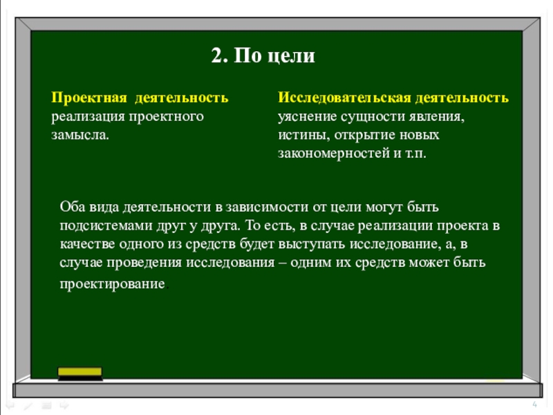 Оба вида деятельности в зависимости от цели могут быть подсистемами друг у друга. То есть, в случае реализации проекта в качестве одного из средств будет выступать исследование, а, в случае проведения исследования – одним их средств может быть проектирование.