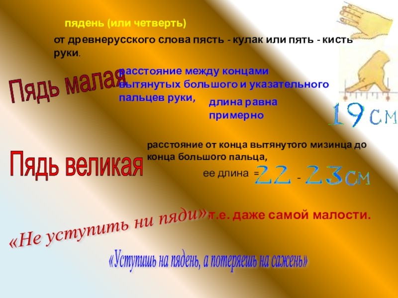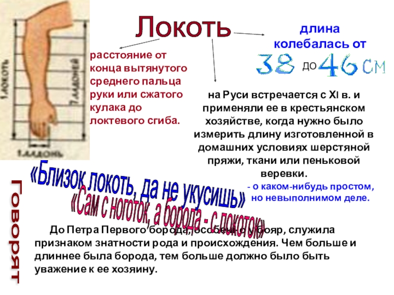 расстояние от конца вытянутого среднего пальца руки или сжатого кулака до локтевого сгиба.
