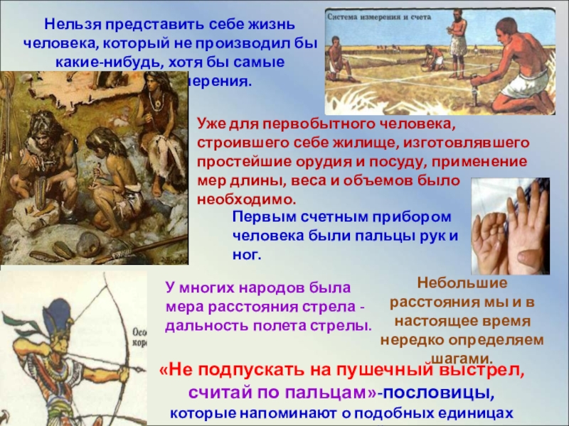 Уже для первобытного человека, строившего себе жилище, изготовлявшего простейшие орудия и посуду, применение мер длины, веса и объемов было необходимо.