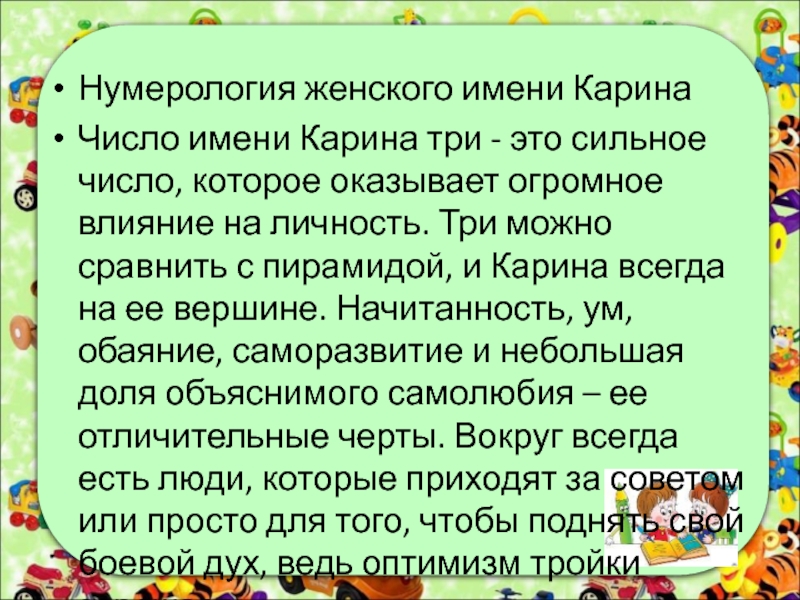 которое оказывает огромное влияние на личность. Три можно сравнить с пирамидой, и Карина всегда на ее вершине. Начитанность, ум, обаяние, саморазвитие и небольшая доля объяснимого самолюбия – ее отличительные черты. Вокруг всегда есть люди, которые приходят за советом или просто для того, чтобы поднять свой боевой дух, ведь оптимизм тройки заражает