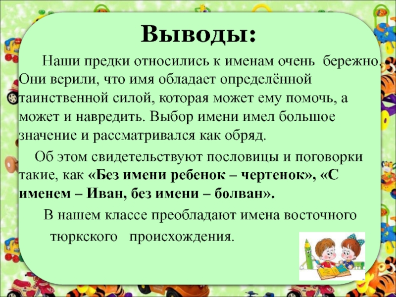 Об этом свидетельствуют пословицы и поговорки такие, как «Без имени ребенок – чертенок», «С именем – Иван, без имени – болван».