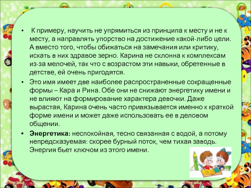 Это имя имеет две наиболее распространенные сокращенные формы – Кара и Рина. Обе они не снижают энергетику имени и не влияют на формирование характера девочки. Даже вырастая, Карина очень часто привязывается именно к краткой форме имени и может даже использовать ее в деловом общении.
