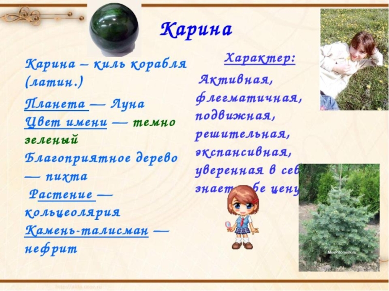 но очень редко – против своих принципов. Поэтому владелицы имени Карина часто достигают успехов в спорте или связывают свою жизнь с кино. И там, и там Карина стремится оказаться на высоких позициях и на первых ролях.Найти свое призвание Карина может также в области, связанной с людьми. Ей по силам стать талантливым педагогом, специалистом в сфере торговли, хорошо знающим свое дело, писать для широкой аудитории – не важно, детективные романы это будут или популярный блог.