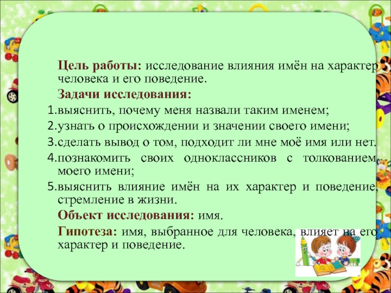 Слайд 5Цель работы: исследование влияния имён на характер человека и его поведение.