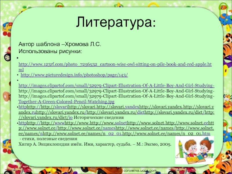 Хигир А. Энциклопедия имён. Имя, характер, судьба. – М.: Эксмо, 2005.