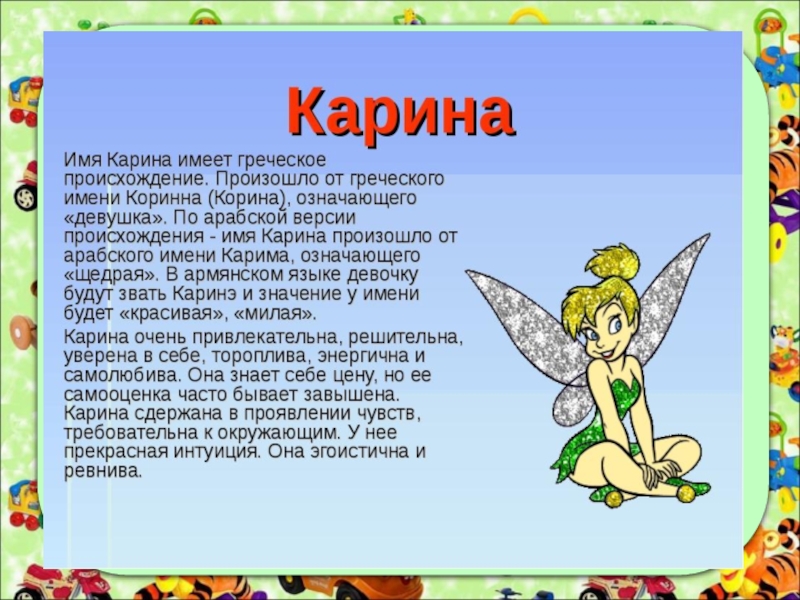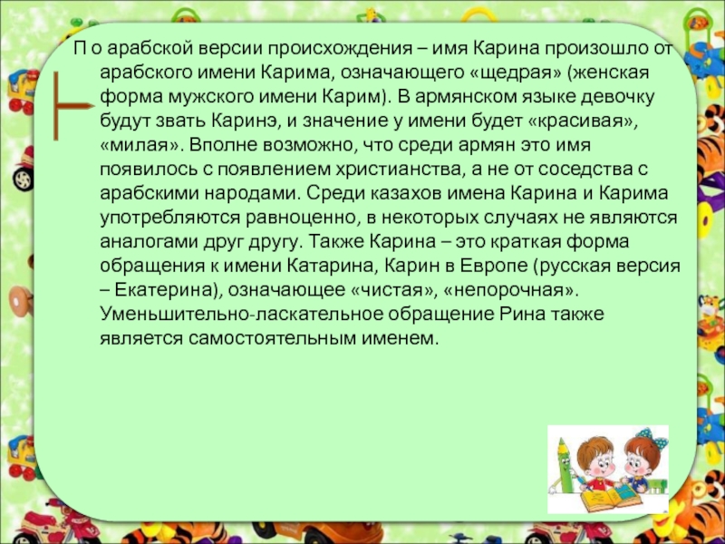 Слайд 16П о арабской версии происхождения – имя Карина произошло от арабского