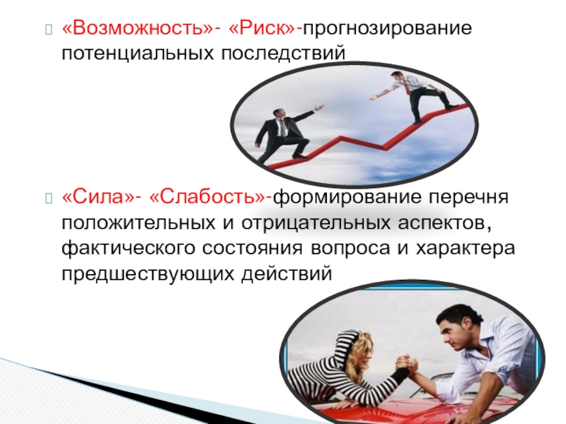 «Возможность»- «Риск»-прогнозирование потенциальных последствий«Сила»- «Слабость»-формирование перечня положительных и отрицательных аспектов, фактического состояния вопроса и характера предшествующих действий