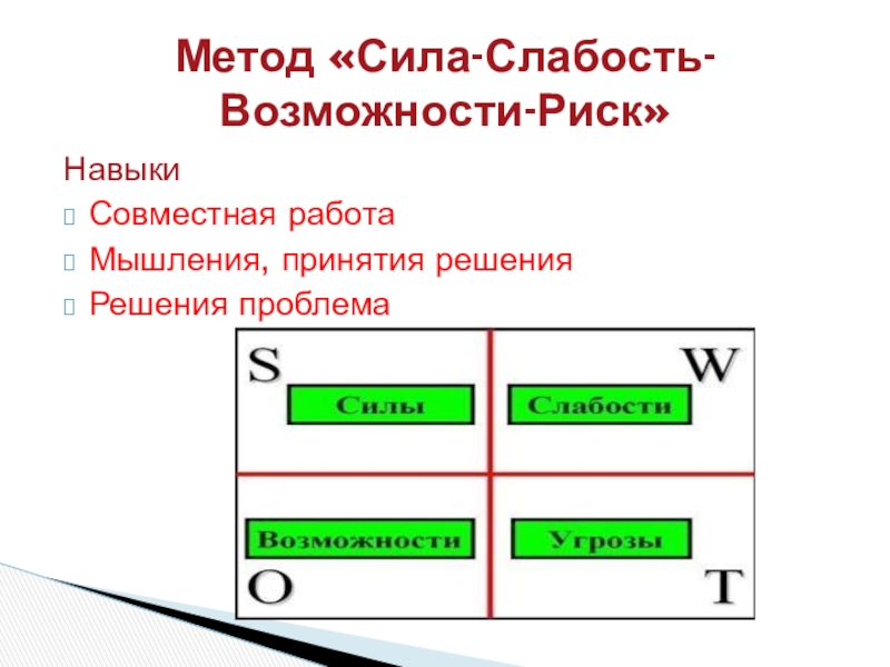НавыкиСовместная работаМышления, принятия решения Решения проблемаМетод «Сила-Слабость-Возможности-Риск»