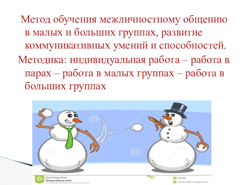Метод обучения межличностному общению в малых и больших группах, развитие коммуникативных умений и способностей. Методика: индивидуальная работа – работа в парах – работа в малых группах – работа в больших группах