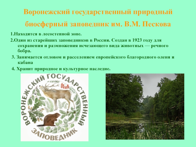 Слайд 9Воронежский государственный природный биосферный заповедник им. В.М. Пескова