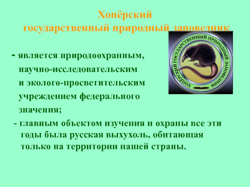- главным объектом изучения и охраны все эти годы была русская выхухоль, обитающая только на территории нашей страны.