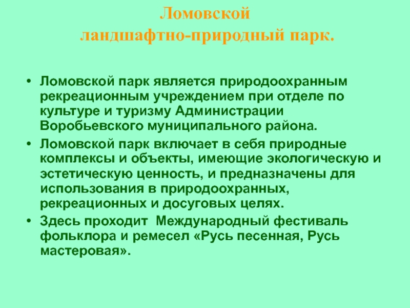 Ломовской парк включает в себя природные комплексы и объекты, имеющие экологическую и эстетическую ценность, и предназначены для использования в природоохранных, рекреационных и досуговых целях.