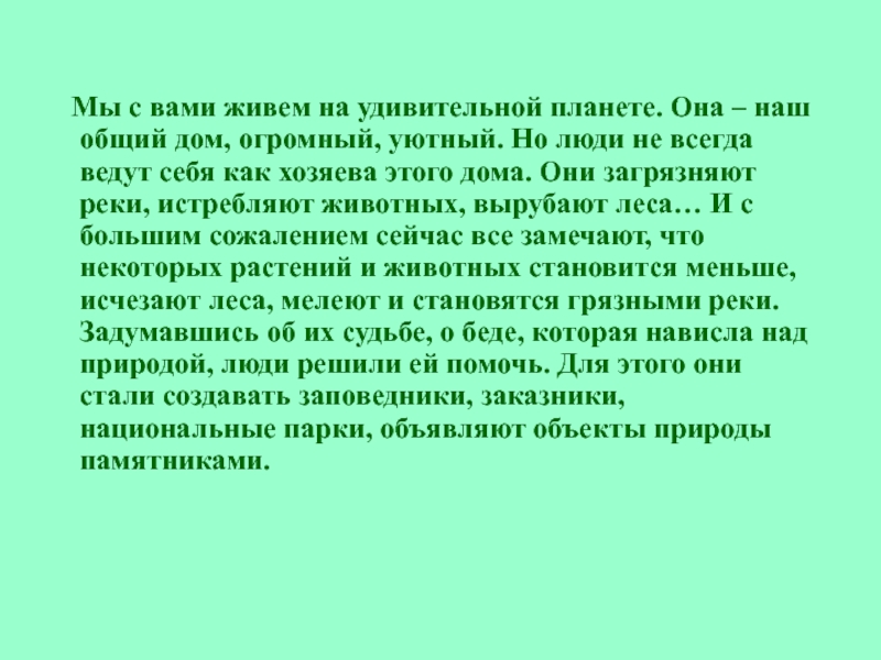 наш общий дом, огромный, уютный. Но люди не всегда ведут себя как хозяева этого дома. Они загрязняют реки, истребляют животных, вырубают леса… И с большим сожалением сейчас все замечают, что некоторых растений и животных становится меньше, исчезают леса, мелеют и становятся грязными реки. Задумавшись об их судьбе, о беде, которая нависла над природой, люди решили ей помочь. Для этого они стали создавать заповедники, заказники, национальные парки, объявляют объекты природы памятниками.