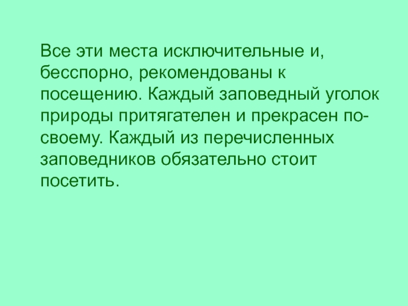 Каждый заповедный уголок природы притягателен и прекрасен по-своему. Каждый из перечисленных заповедников обязательно стоит посетить.