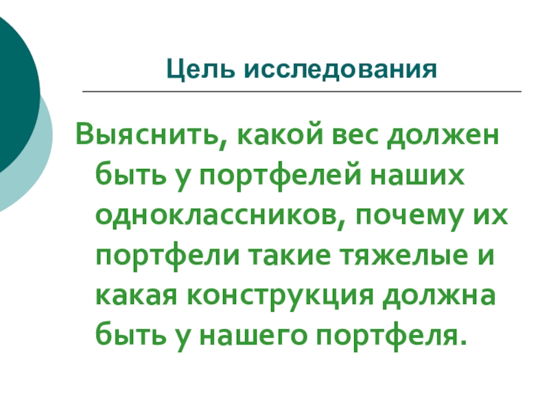 Цель исследованияВыяснить, какой вес должен быть у портфелей наших одноклассников, почему их портфели такие тяжелые и какая