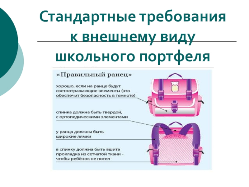 Слайд 9Стандартные требования к внешнему виду школьного портфеля