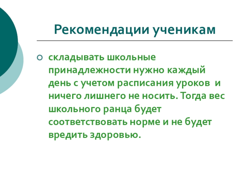 Рекомендации ученикамскладывать школьные принадлежности нужно каждый день с учетом расписания уроков и ничего лишнего не носить. Тогда