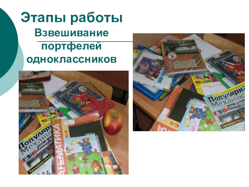 Слайд 4Этапы работы Взвешивание портфелей одноклассников