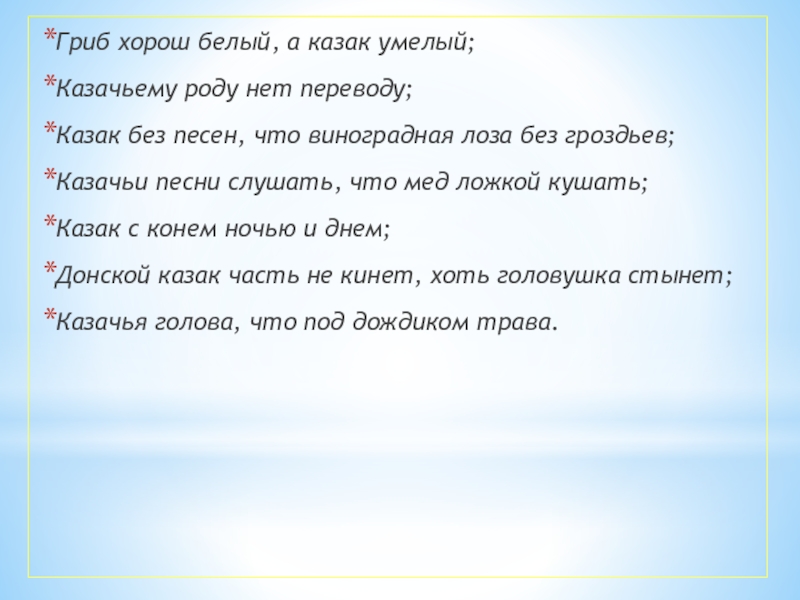 Гриб хорош белый, а казак умелый;Казачьему роду нет переводу;Казак без песен, что виноградная лоза без гроздьев;Казачьи песни