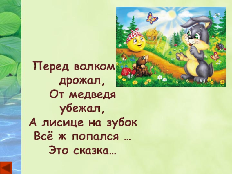 Перед волком не дрожал,От медведя убежал,А лисице на зубокВсё ж попался …Это сказка…