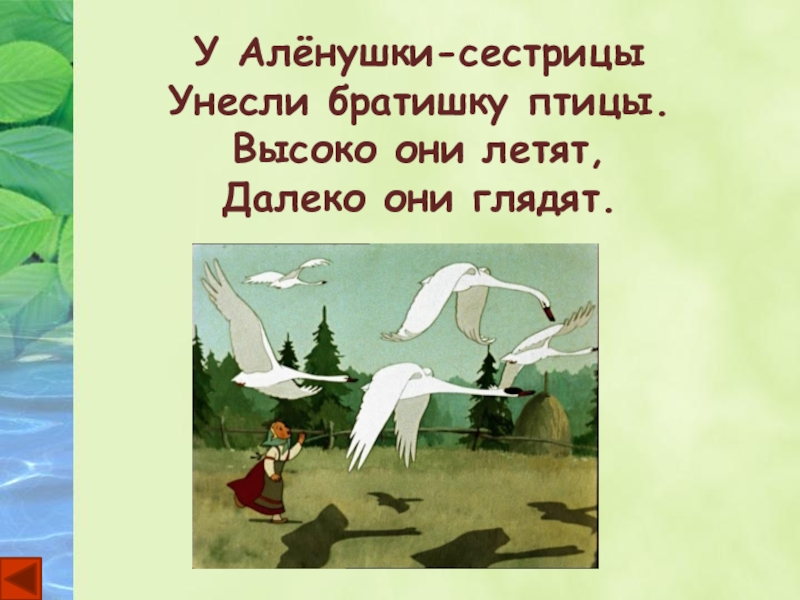 У Алёнушки-сестрицы Унесли братишку птицы. Высоко они летят, Далеко они глядят.