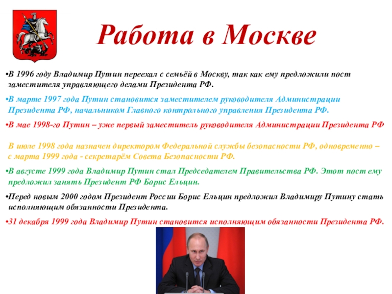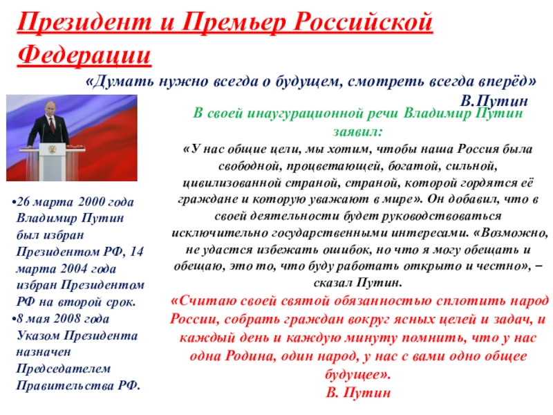 26 марта 2000 года Владимир Путин был избран Президентом РФ, 14 марта 2004 года избран Президентом РФ на второй срок.