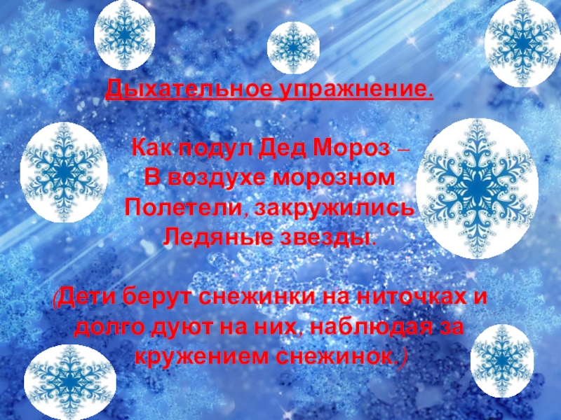 снежинки на ниточках и долго дуют на них, наблюдая за кружением снежинок.)