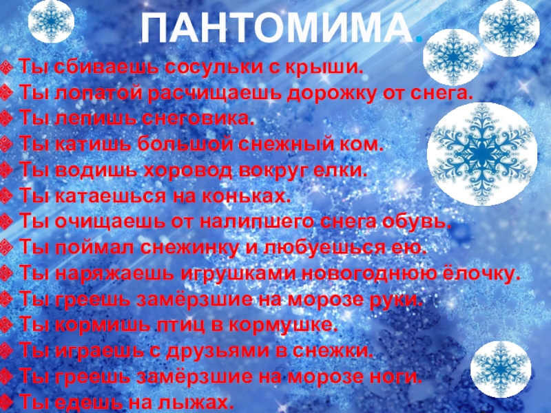 присесть, опустив снежинку на пол.)