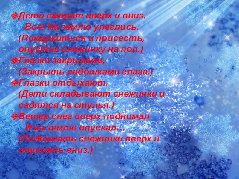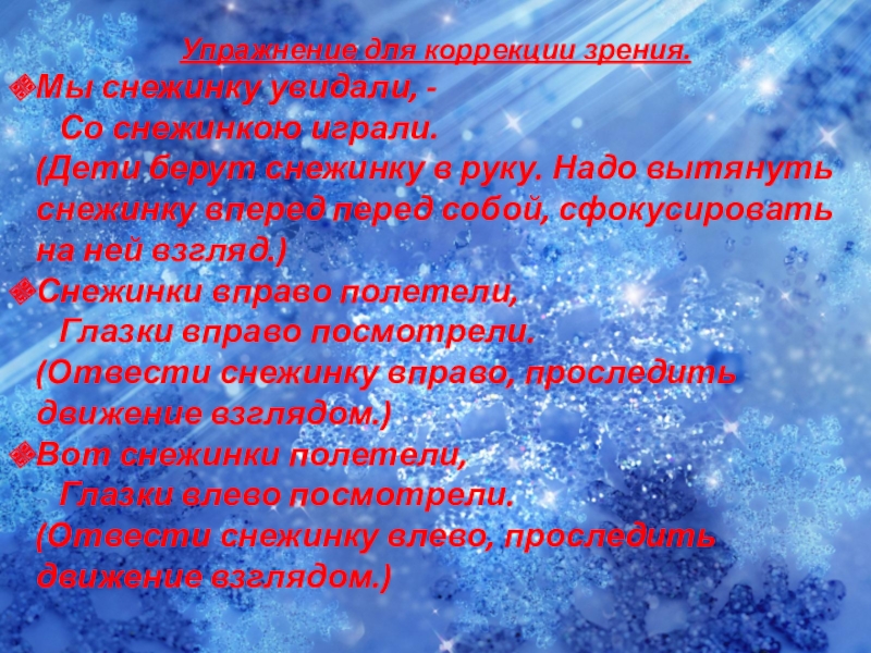 берут снежинку в руку. Надо вытянуть снежинку вперед перед собой, сфокусировать на ней взгляд.)
