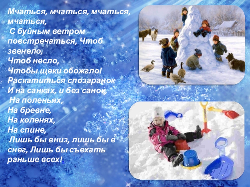 Не успею сесть верхом, Санки – с места и бегом… Мои санки едут сами,