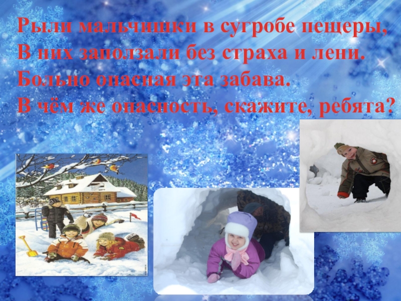 Слайд 28Рыли мальчишки в сугробе пещеры,